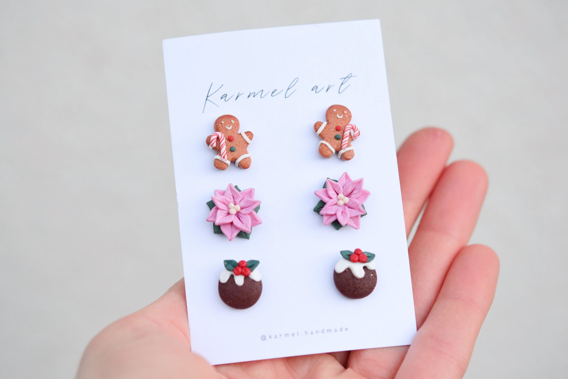 Handmade Christmas set of 3 pairs of stud earrings - gingerbread man, pink poinsettia and Christmas pudding. This set is perfect as a cute Christmas accesory or a gift. Each piece is carefully hand-sculpted, making every pair truly one of a kind. Lightweight and comfortable for everyday wear.