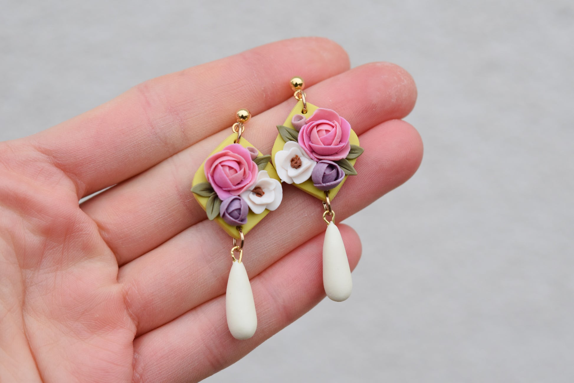 Delicate floral earrings handmade from polymer clay, inspired by soft garden blooms. Each flower is carefully hand-sculpted, making every pair truly one of a kind. Lightweight and comfortable for everyday wear.