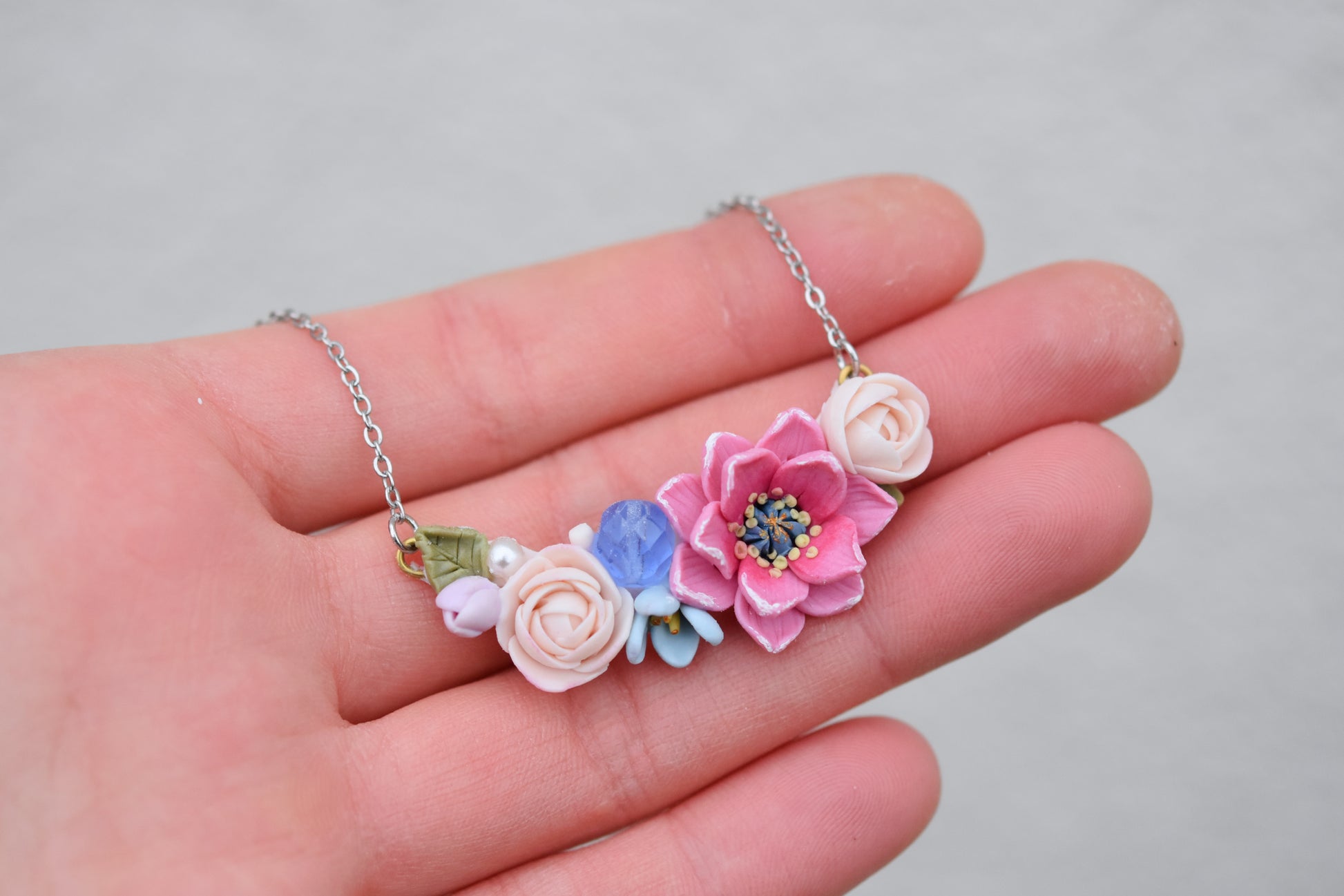 Dainty floral necklace handmade from polymer clay. Each flower is carefully hand-sculpted, making every piece truly one of a kind. Lightweight and comfortable for everyday wear.