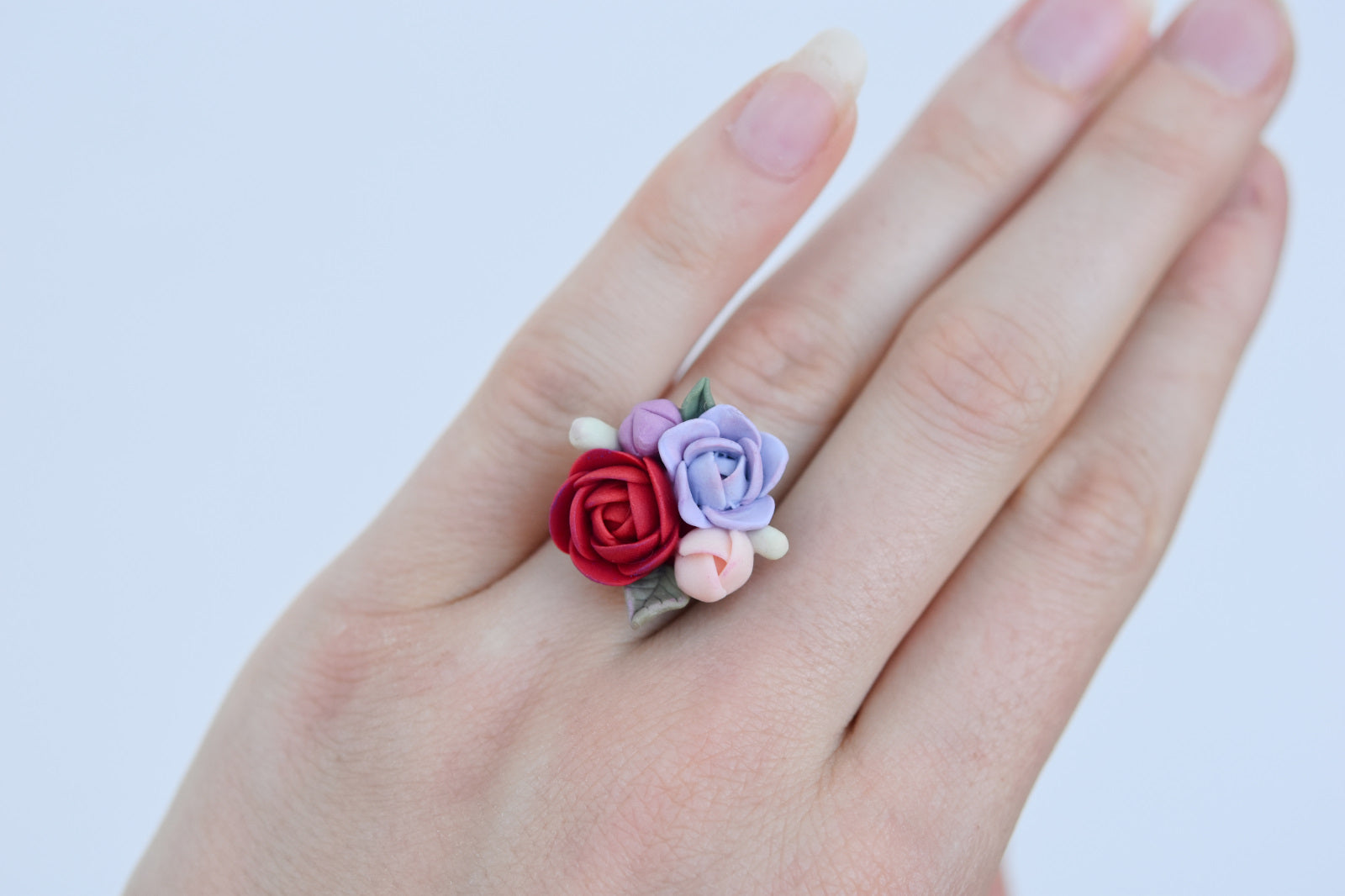 Delicate floral ring handmade from polymer clay, inspired by soft garden blooms. Each flower is carefully hand-sculpted, making every piece truly one of a kind. Lightweight and comfortable for everyday wear.