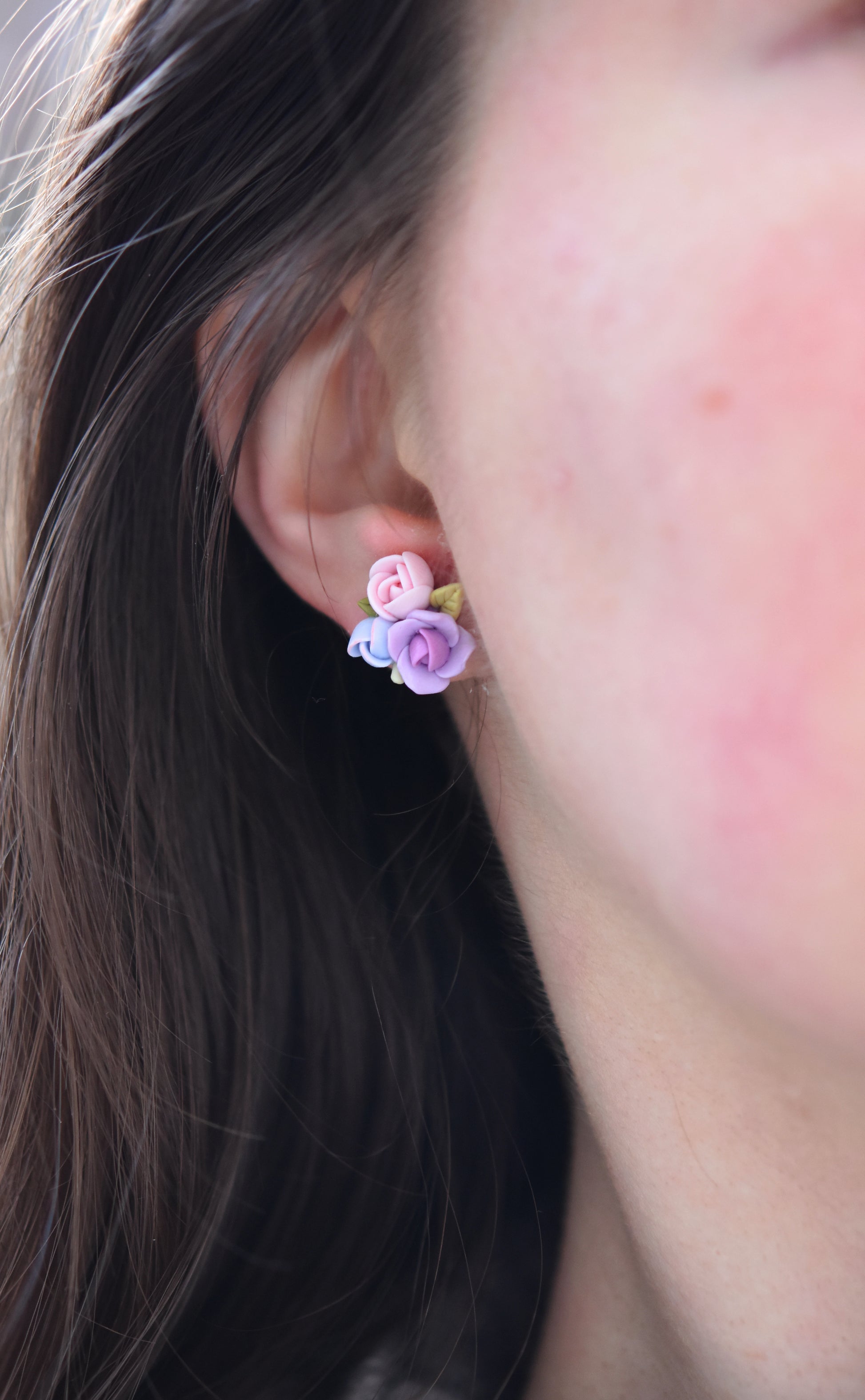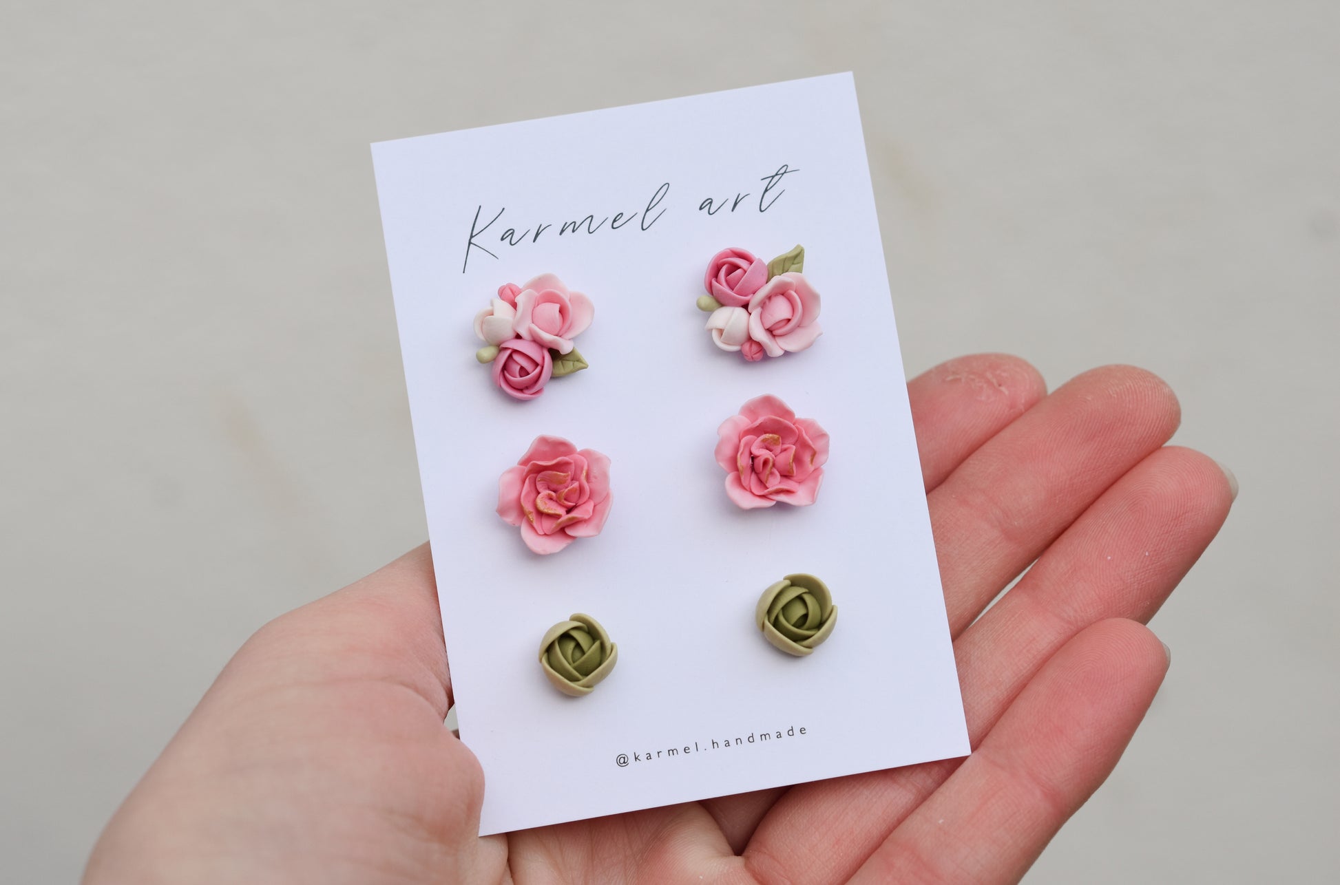 Set of 3 pairs of floral studs handmade from polymer clay, inspired by soft garden blooms. Each flower is carefully hand-sculpted, making every pair truly one of a kind. Lightweight and comfortable for everyday wear.