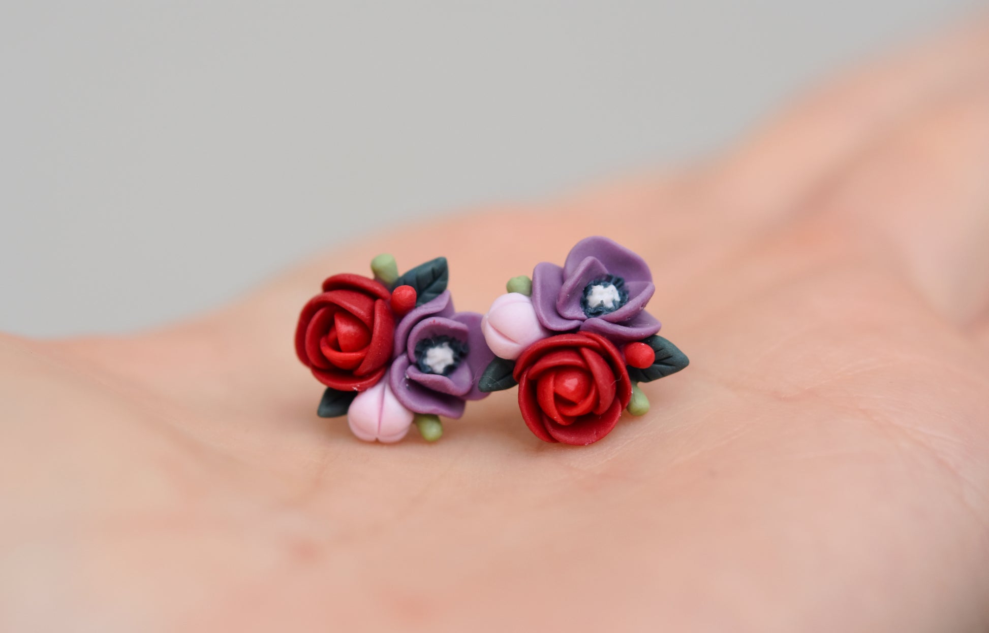 Delicate floral studs handmade from polymer clay, inspired by soft garden blooms. Each flower is carefully hand-sculpted, making every pair truly one of a kind. Lightweight and comfortable for everyday wear.